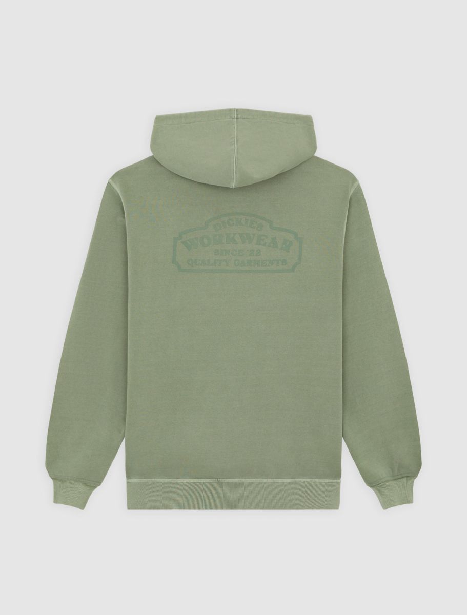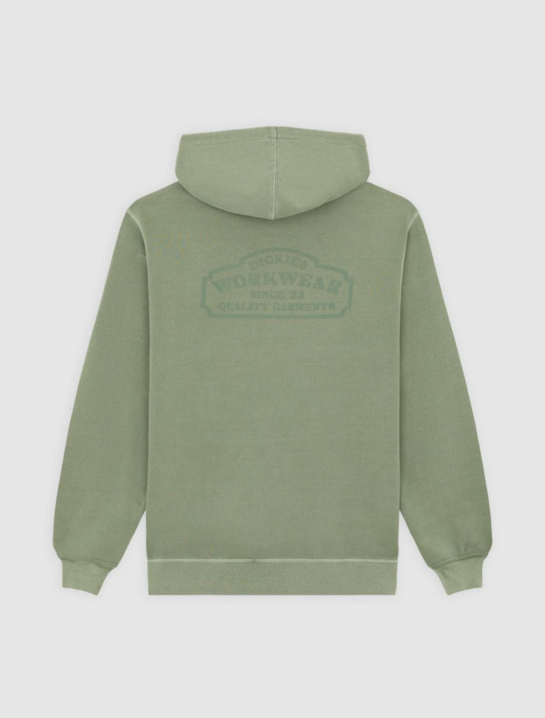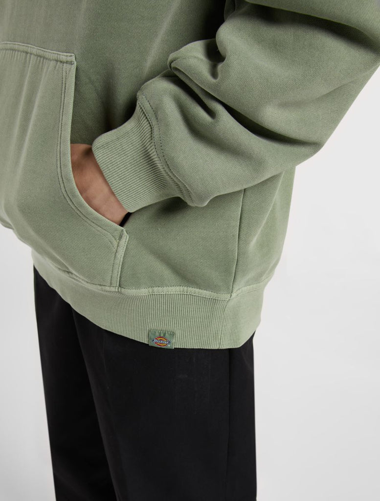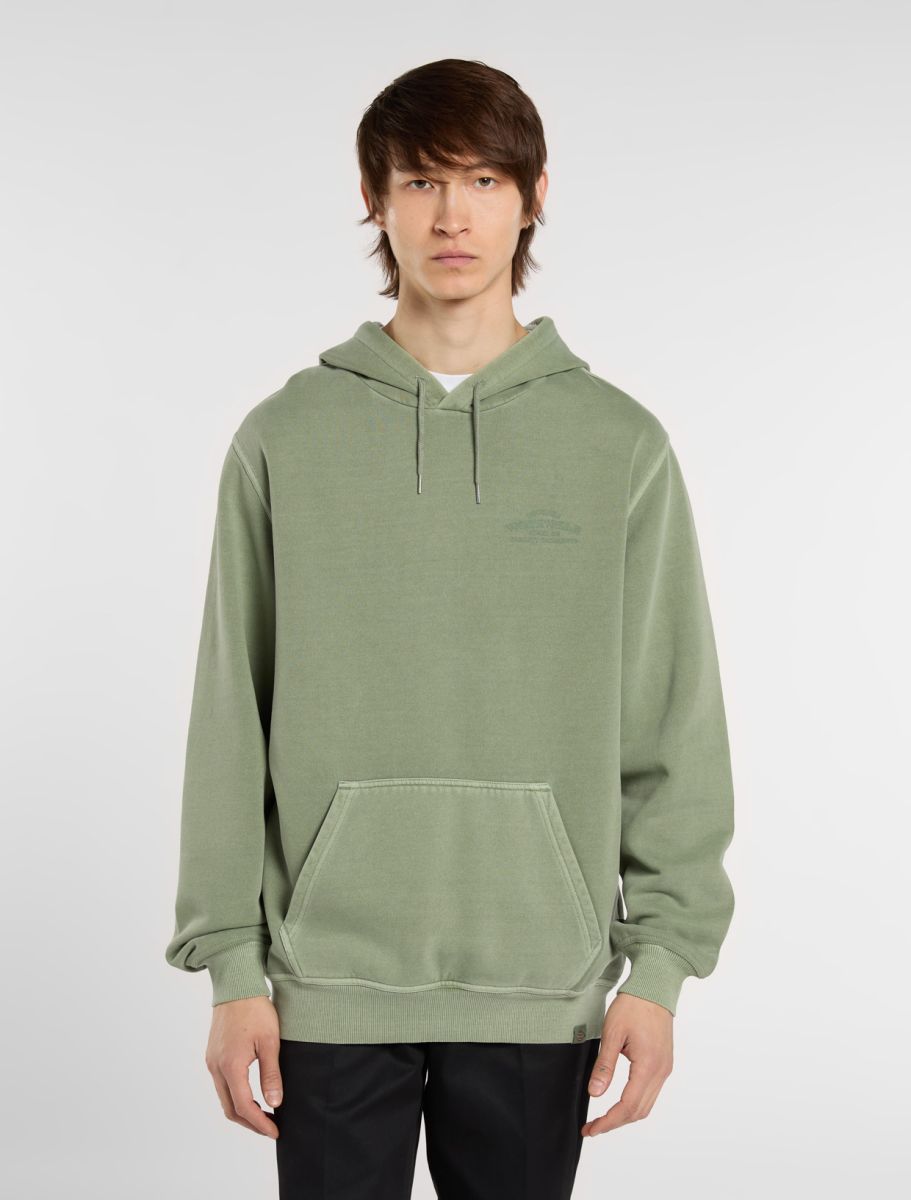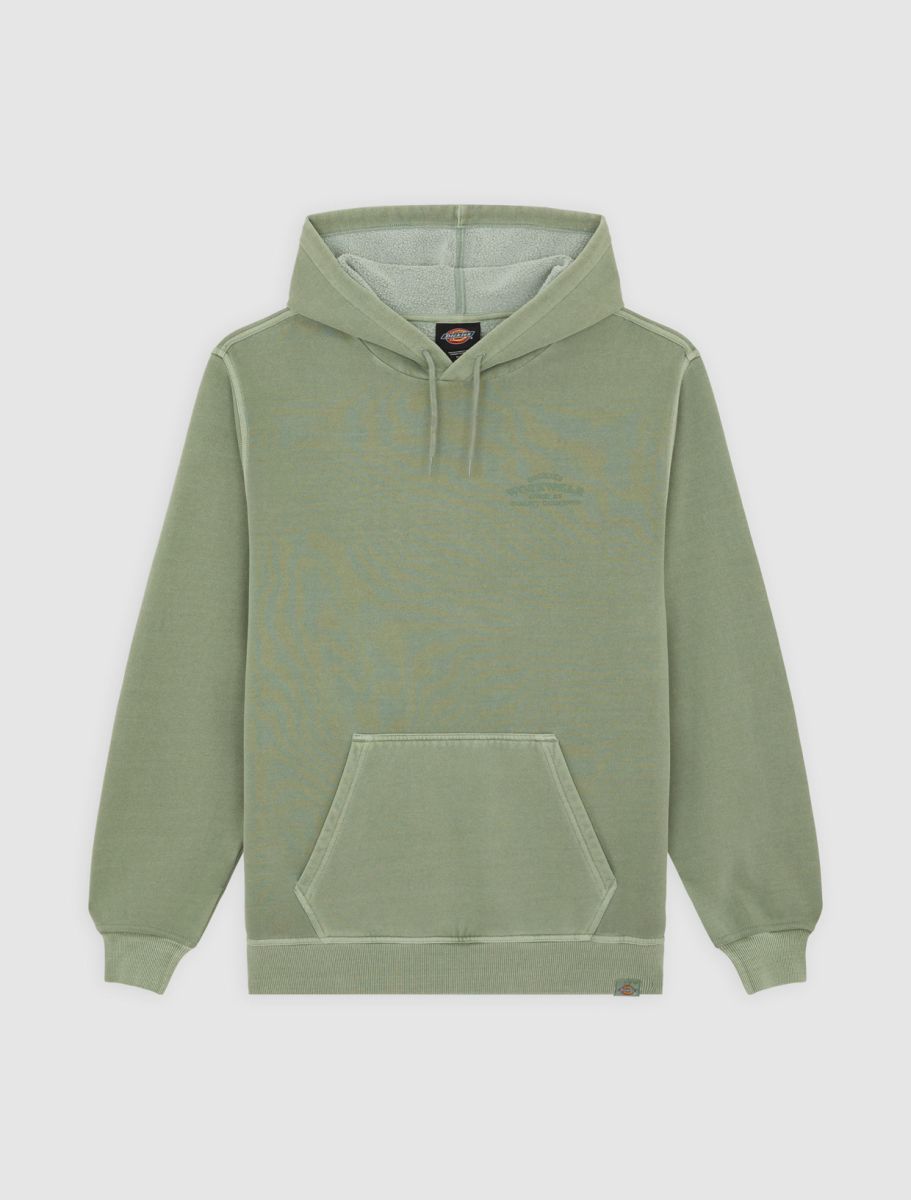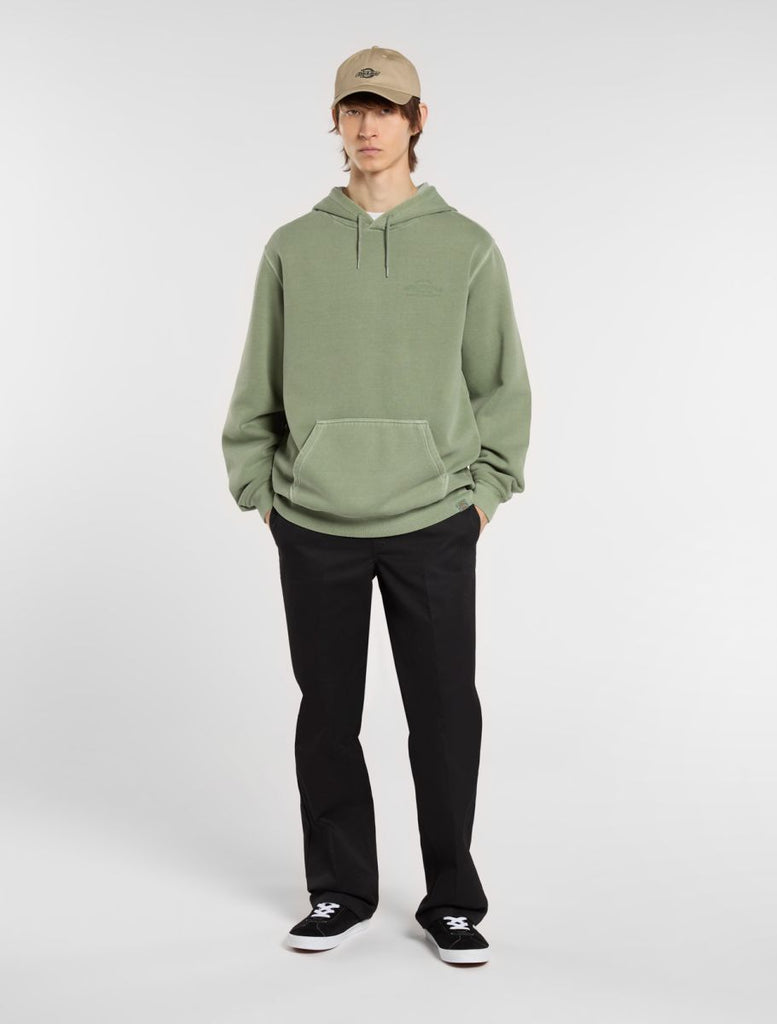 The Christiana garment dye pullover hoodie from Dickies is a relaxed fit hooded sweatshirt with a unique finish, designed to be a comfortable and warm everyday piece for the colder months. It comes with a kangaroo pocket, a dyed-to-match woven Dickies hem loop label, and vintage-inspired signage artwork graphics.