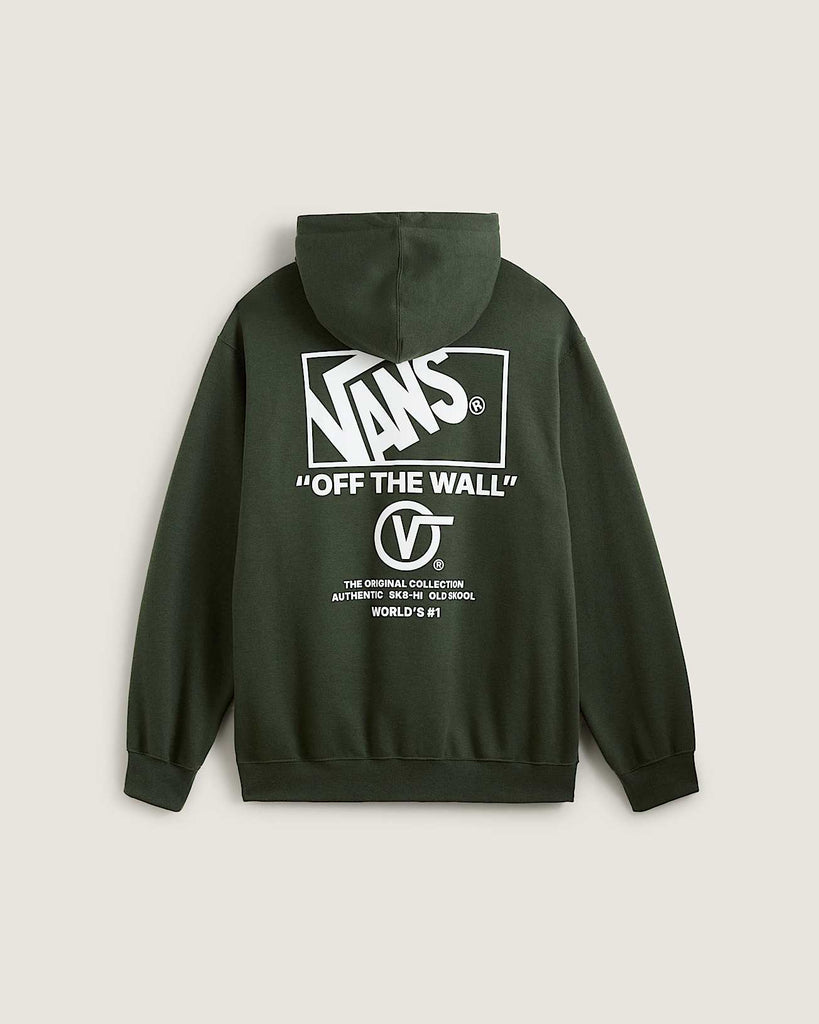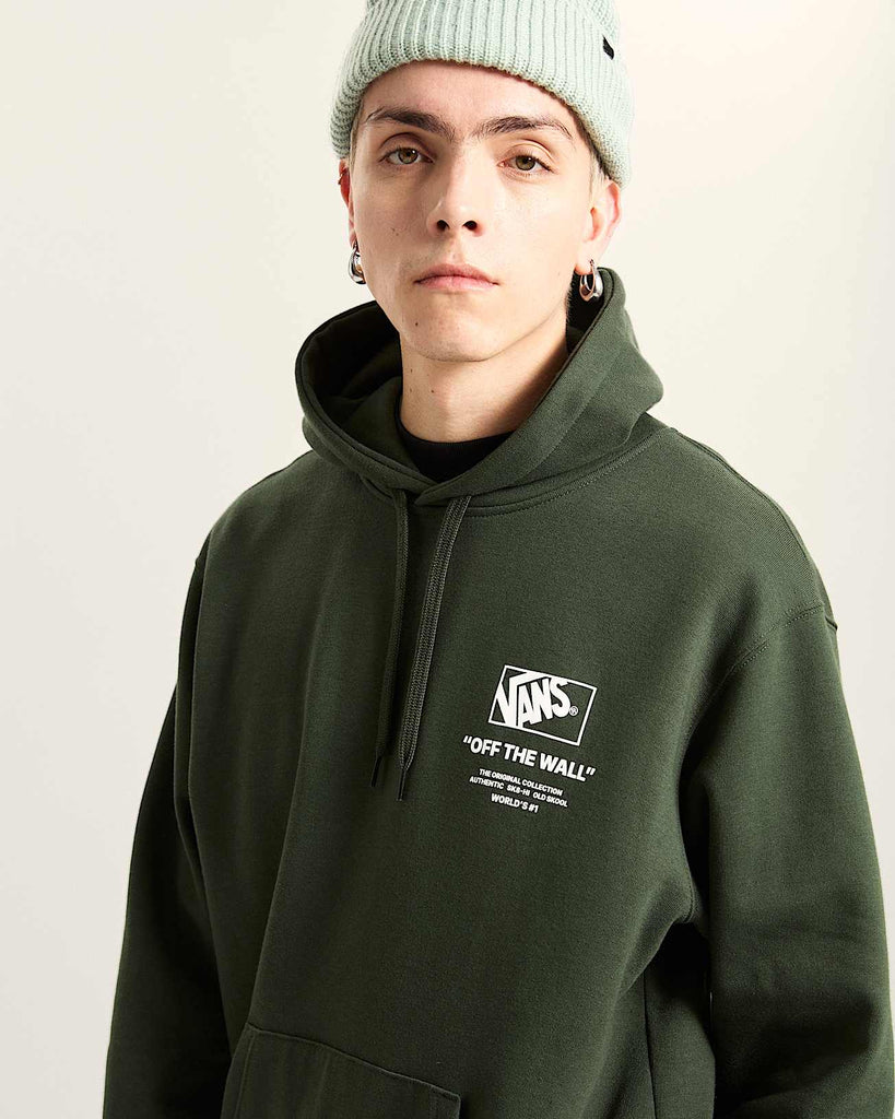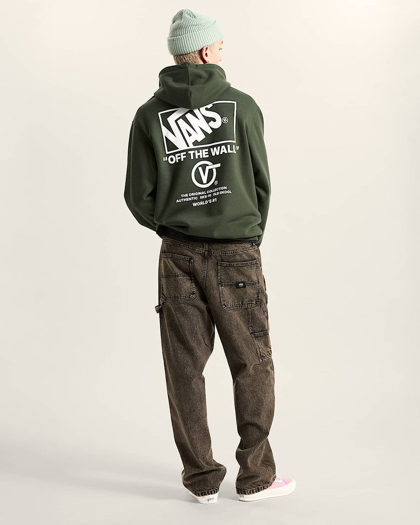 Van's super-soft Stockpile Pullover hoodie offers ultimate comfort thanks to its brushed back cotton fabric. This design features XL screenprinted logo graphics across the back and a boxed logo graphic on the wearer's left.
