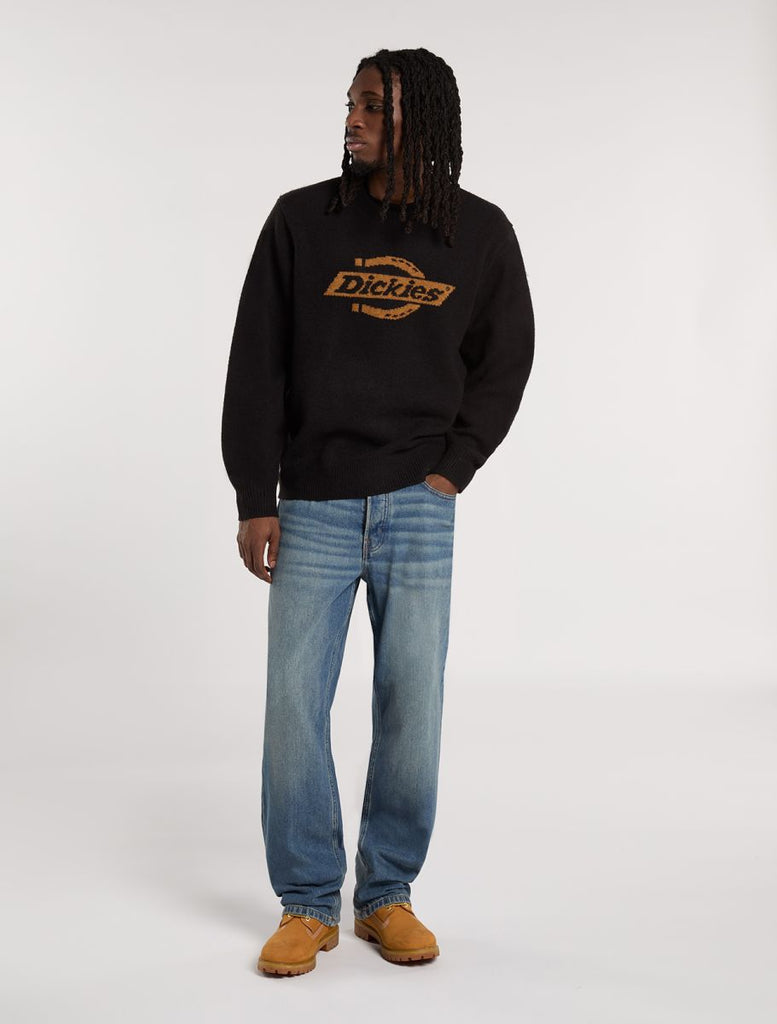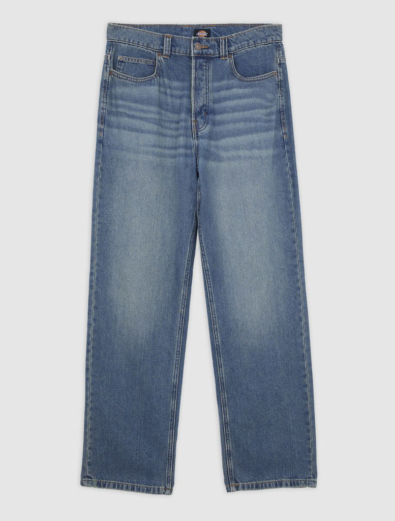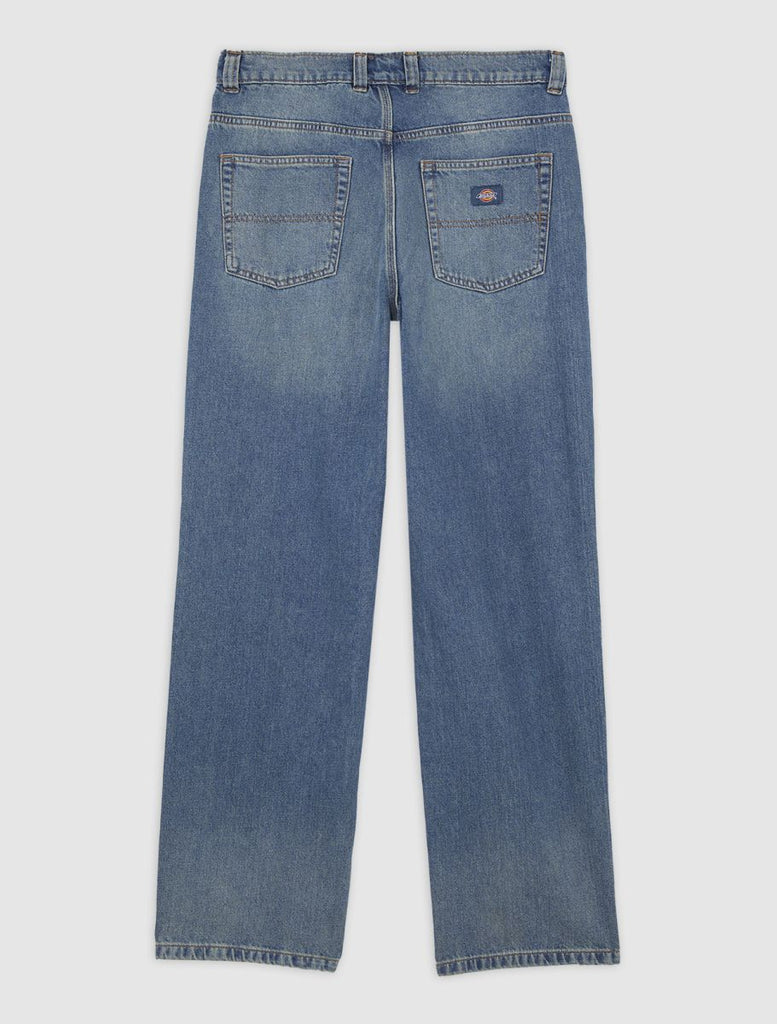 In a classic five pocket cut, these loose fit denim jeans from Dickies are made for laidback days. They're straight and relaxed on the leg, with a regular rise waist for easy style and all-day comfort and collegiate, sports-inspired feel.